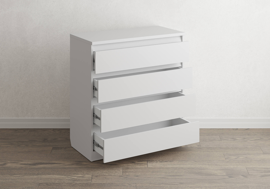 Aksel - комод без лишнего. Лаконичная скандинавская форма, четыре варианта цвета и скос под плинтус позволяют вписать его в любую комнату: спальню, гостиную, детскую или домашний кабинет и встать вплотную к стене без зазора. Надёжные шариковые направляющие обеспечивают плавное и лёгкое выдвижение ящиков без рывков и перекосов.