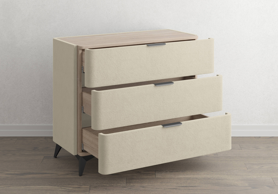 Sheldon - комод, который выделяется не за счёт громкой формы, а за счёт точных деталей. Мягкий корпус в сочетании со столешницей из ЛДСП "Дуб Сонома", изящные металлические ручки и высокие чёрные ножки - всё это работает вместе, создавая образ дорогой мебели. Три ящика на скрытых направляющих с доводчиками закрываются без хлопка и не выпадают при случайном толчке.